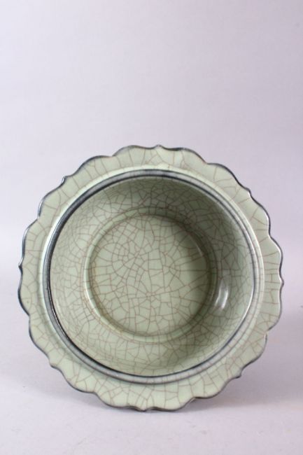 A CHINESE BARBED RIM GUAN GLAZED POTTERY DISH, the flared rim with ironwire style body decoration, 22cm diameter