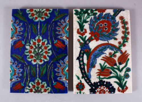 TWO IZNIK STYLE POTTERY TILE SECTIONS, one with white ground and floral motif and feather decoration, the other with a blue ground with similar decor, 24cm x 16cm.