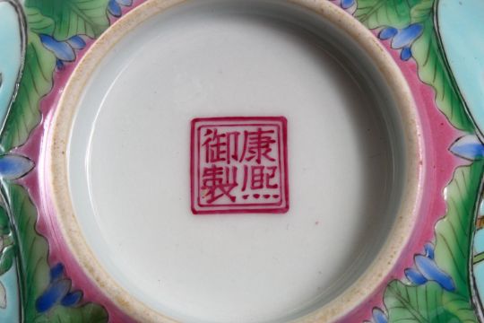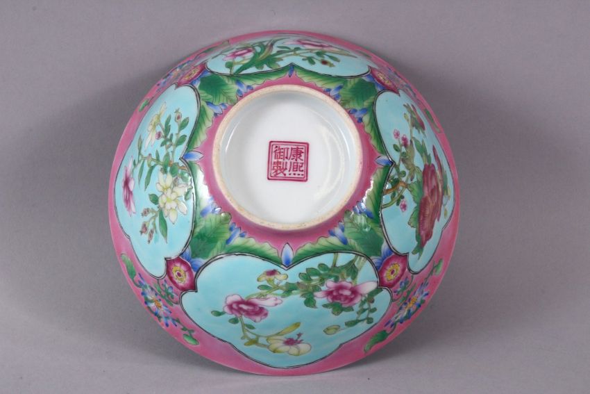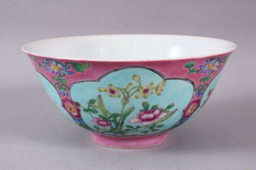 A CHINESE FAMILLE ROSE TURQUOISE & PINK GROUND PORCELAIN BOWL, decorated with panels of native flora, the base with a four character mark, 15cm.
