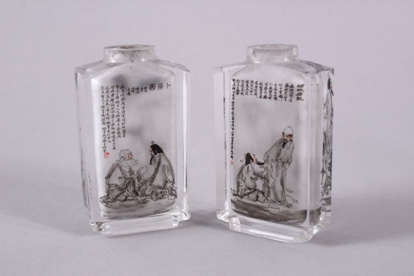 TWO CHINESE REVERSE PAINTED GLASS SNUFF BOTTLES, one depicting seated immortals and horses, with bands of calligraphy, the other depicting immortals seated with cranes, again with calligraphy, 7cm high x 4cm wide.