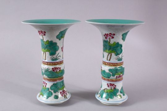A PAIR OF CHINESE DOUCAI DECORATED FLARED RIM PORCELAIN VASES, each decorated with sprays of lotus upon waves, the interior and base with turquoise glaze, the bases each bearing a six character mark, 23cm high x 15.5cm