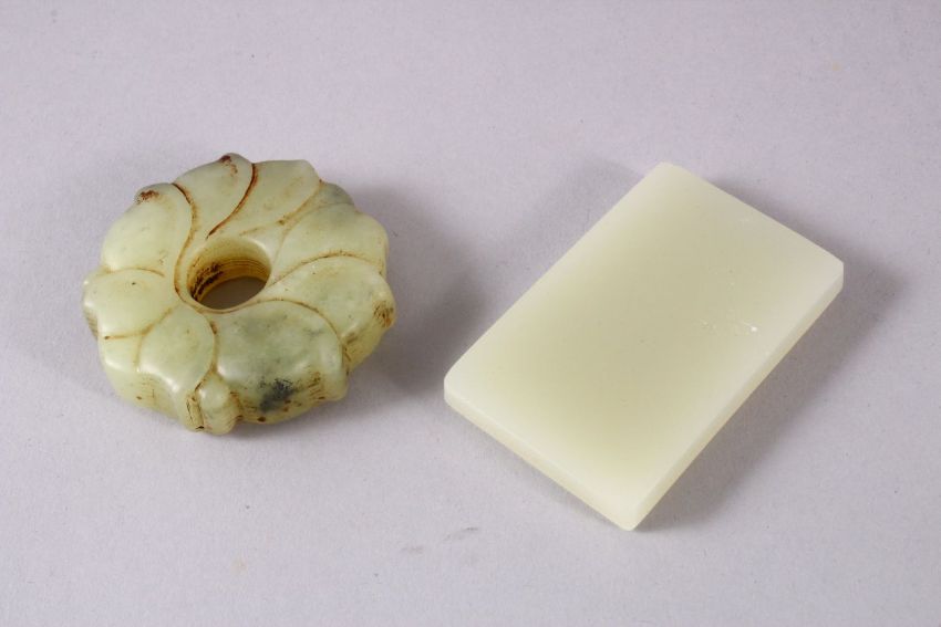 TWO CHINESE CARVED JADE BI & TABLET / PENDANT, one carved in the form of lotus, 5cm, the other of a figure with calligraphy, 6cm x 4cm