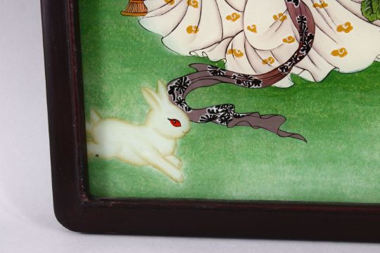 A PAIR OF REVERSE PAINTED FRAMED PICTURES, of young ladies, 34cm x 23cm.