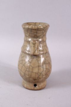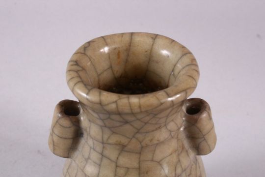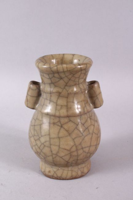 A CHINESE TWIN HANDLE GE STYLE PORCELAIN VASE, 13cm high.