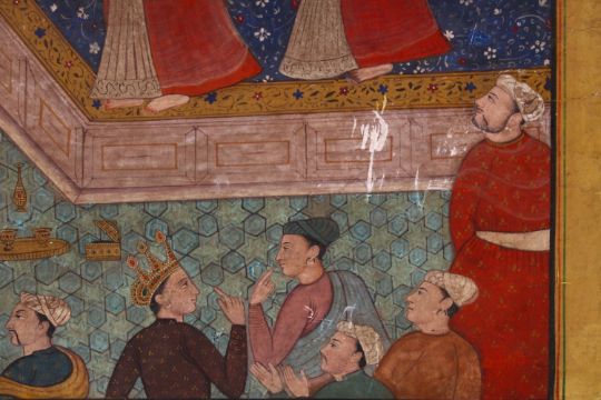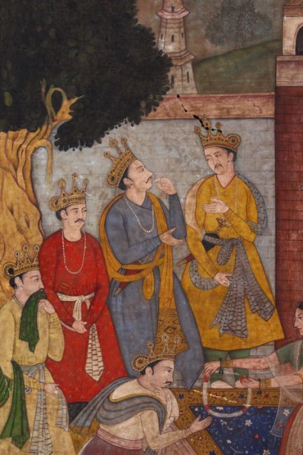 A 19TH CENTURY INDIAN PAINTING ON CARDBOARD - depicting princes before princess in a garden setting, 41cm x 32cm