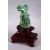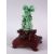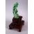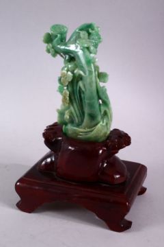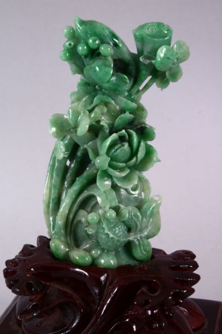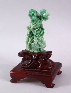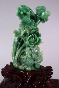 A GOOD GREEN JADITE CARVING OF FLOWERS, 13cm high, on a carved wooden stand.