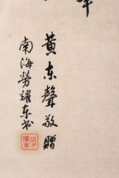 A CHINESE PAINTED CALLIGRAPHY WORK PICTURE, a presentation painting for DR Meltzer from Waleter, From the philosopher Hung Fei Zhu in the chapter called difficulty, " Use your own spear to pierce through your own shield", framed 54cm x 43cm.