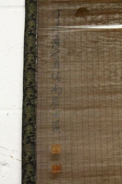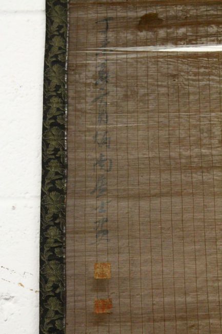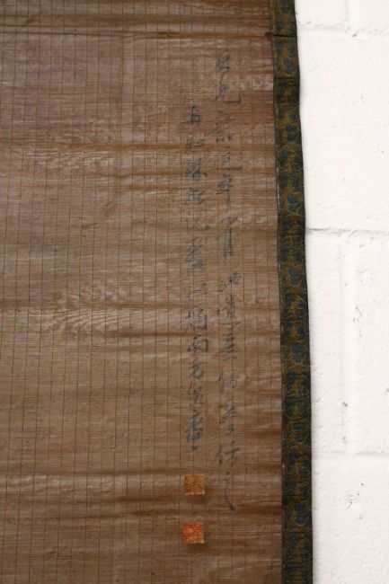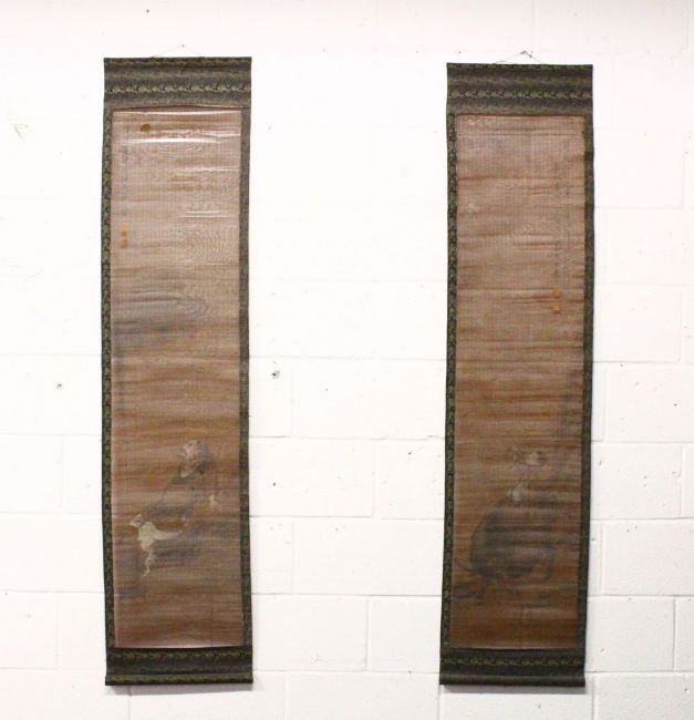 A PAIR OF CHINESE METAL WIRE MESH PAINTED SCROLLS, each formed of metal wires, one painted depicting a boy flying a kite upon the back of an ox, with calligraphy, the other depicting a man as a horse seated, each with calligraphy signatures with two paper seal marks, each approx 180cm high.