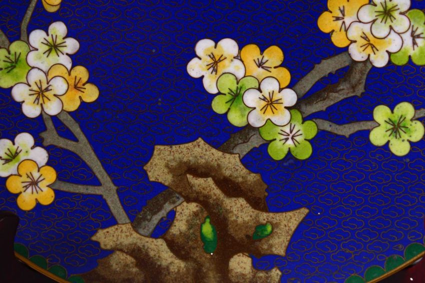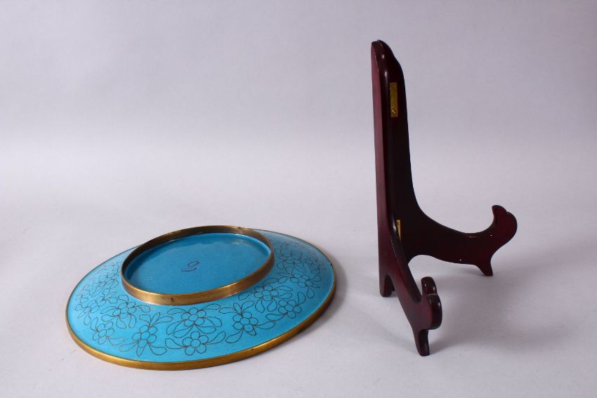 A CHINESE CLOISONNE PLATE & STAND - the dish with a royal blue ground with prunus decoration, 23cm