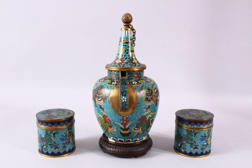 A 19TH CENTURY CHINESE CLOISONNE EWER & TWO LIDDED TEA CADDIES, the ewer decorated with a blue ground with scenes of lotus and lion dogs with balls and flames, mounted to a wooden base with residue, the two lidded caddies with prunus / floral decoration upon blue ground, the underside with a floral basket amongst clouds, the ewer 29cm high x 22cm wide, the boxes 8cm high & wide.