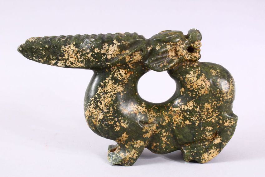 A CHINESE CARVED HARDSTONE FIGURE OF A DRAGON, in archaic form, looking behind, 26cm wide.