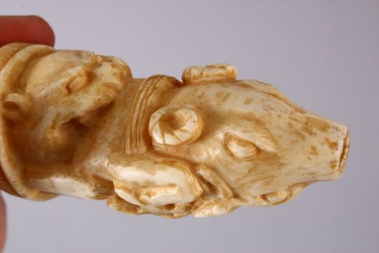 A 19TH CENTURY INDIAN MUGHAL CARVED IVORY POWDER FLASK, carved with scenes of animals, including a fish, horse head, tiger and a boar emerging from a tigers mouth, 25cm