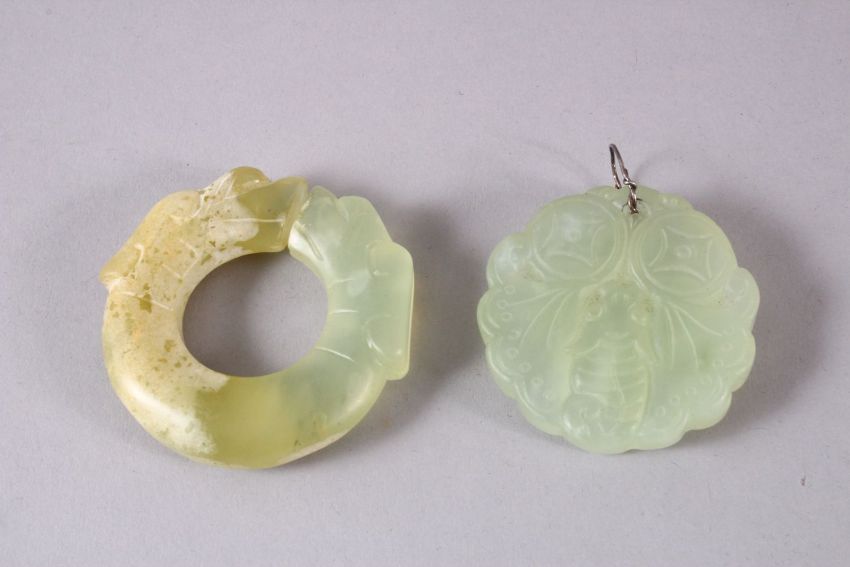 TWO CHINESE CARVED JADE BUTTERFLY & DRAGON BI DISK PENDANTS, one pale almost translucent jade carved as butterfly 4.5cm, together with a jade carved dragon pendant, 5.5cm.