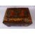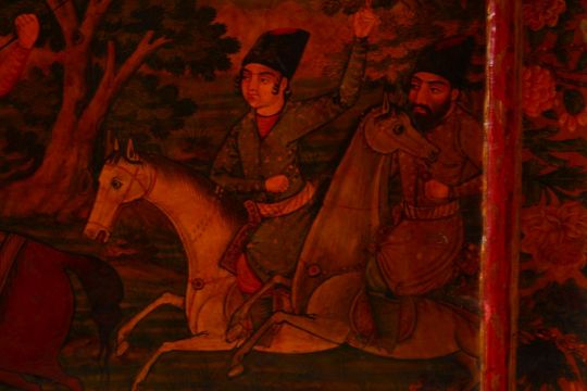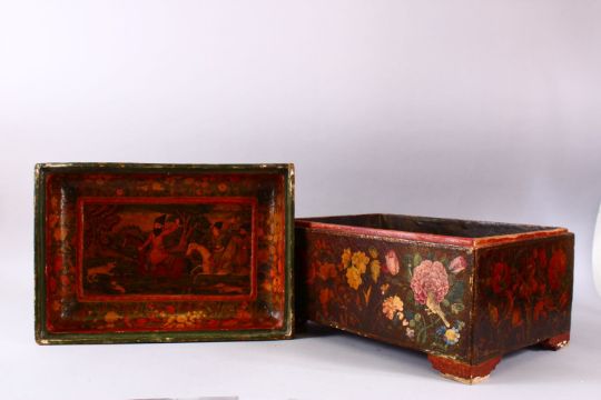 A GOOD PERSIAN QAJAR LACQUER PAINTED LIDDED BOX, decorated to the exterior with birds and detailed sprays of native flora, the lid decorated with gold spray and flora with a central painting depicting figures with gifts to a noble figure, the underside of the lid again finely painted with a panel depicting noblemen upon horseback attacking tigers, 28cm x 42cm x 28cm deep.