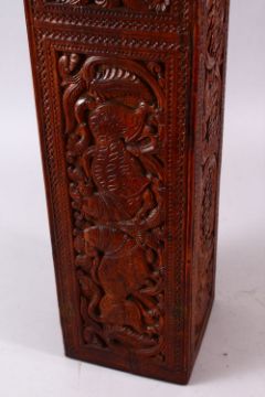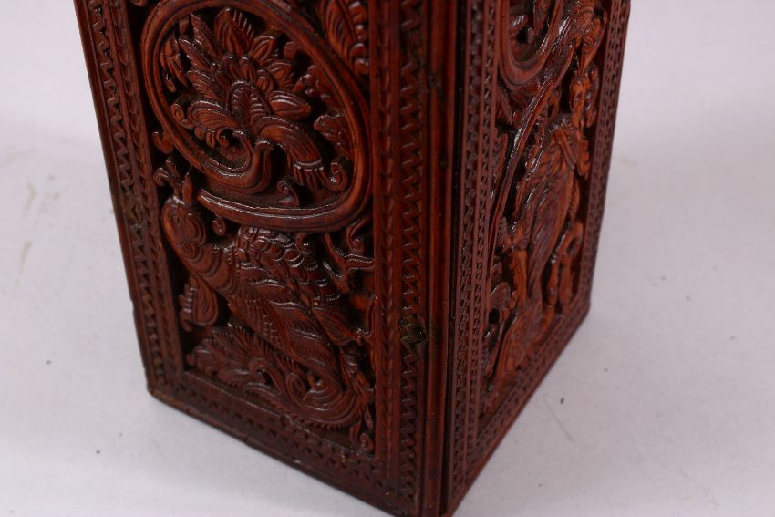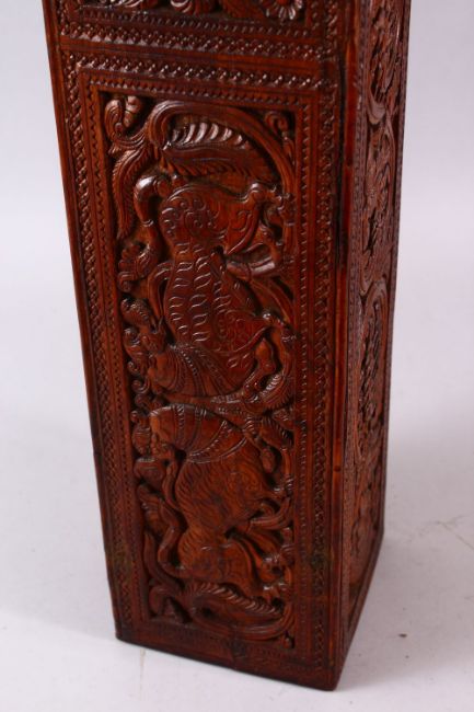A GOOD LARGE 19TH CENTURY INDIAN OR SRI LANKAN CARVED WOOD PRESENTATION BOX possibly for a sword, three sides carved with stylised flowers and birds, the forth side with plain panel for inscription flanked by carved mythological beasts, 125cm long, 14cm wide.