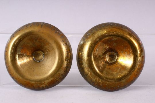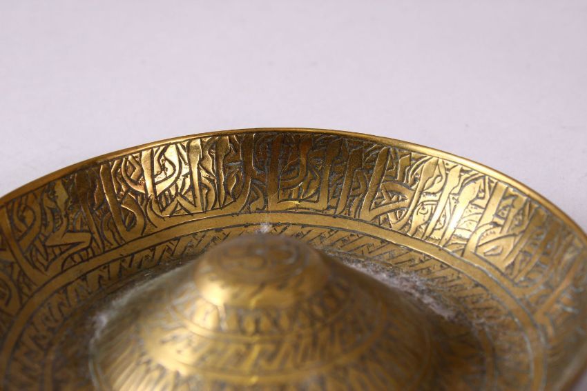 A PAIR OF ISLAMIC MAMLUK REVIVAL DAMASCUS BRASS BOWLS, with raised centres and engraved decoration, 12cm diameter.