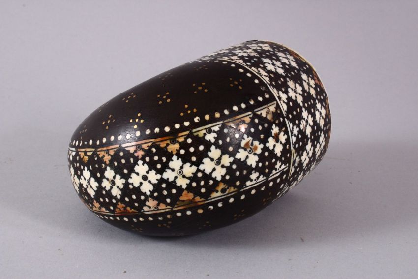 A FINE 18TH / 19TH CENTURY HARDWOOD INLAID INDO PORTUGUESE PODER FLASK, inlaid with ivory border design and metal std decoration, with a carved ivory top and stopper, 15cm high x 12.5cm wide.