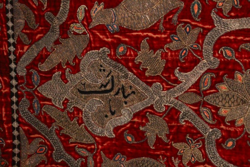 A GOOD 19TH CENTURY ISLAMIC SILK & METAL THREAD EMBROIDERED WALL HANGING, decorated with birds and floral borders, with central panels of calligraphic script, 140cm x 95cm