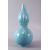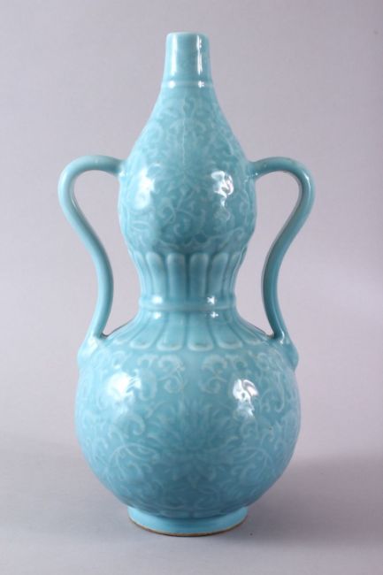 A CHINESE PALE BLUE GLAZED PORCELAIN DOUBLE GOURD VASE, the body carved with lotus decoration and twin handles, the base with a six character mark, 38cm high.