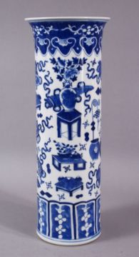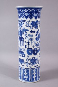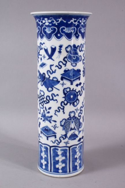 A GOOD 19TH CENTURY CHINESE BLUE AND WHITE SLEEVE VASE, painted with precious objects, 30cm high.