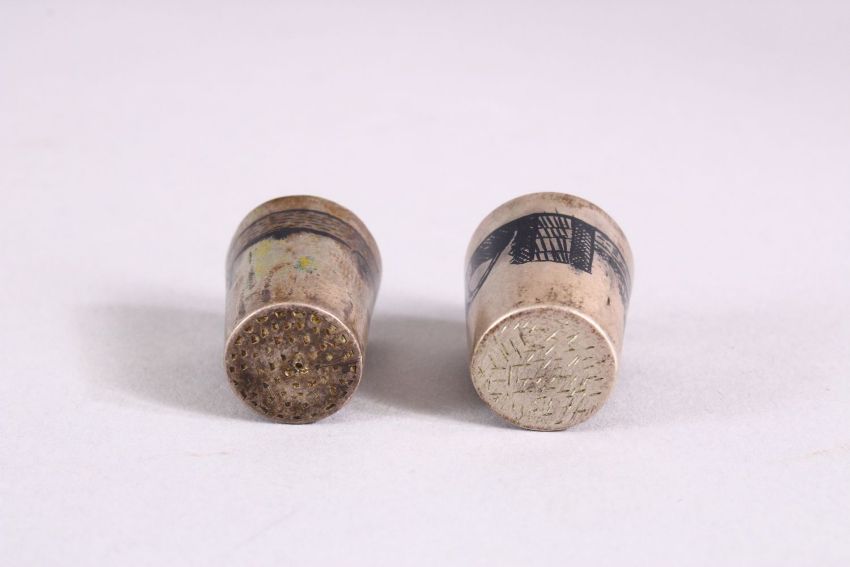 TWO 19TH CENTURY IRAQ SILVER & NIELLO INLAID THIMBLES, each with inlaid landscape views,