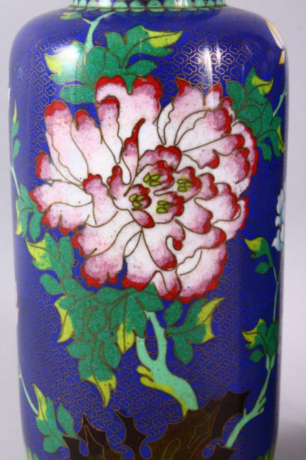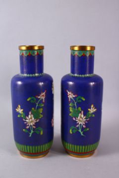 A PAIR OF CHINESE CLOISONNE BLUE GROUND VASES - each with a royal blue ground and native display of lotus, 26cm high.