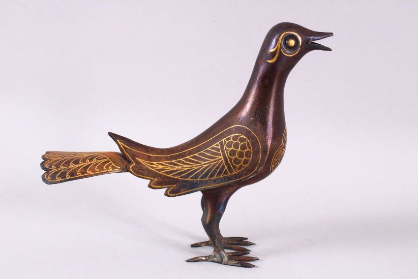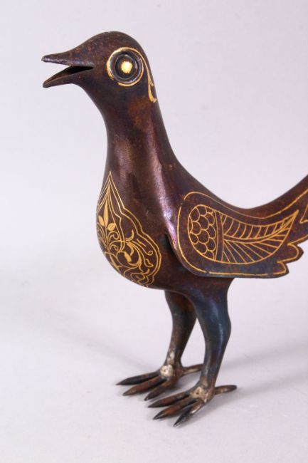 A PERSIAN QAJAR GOLD DAMASCENED IRON MODEL OF A BIRD, 15.5cm high x 18cm long.