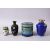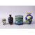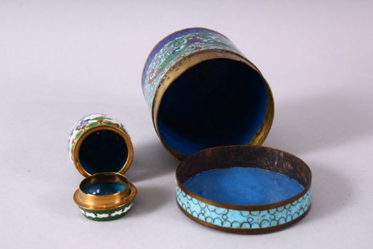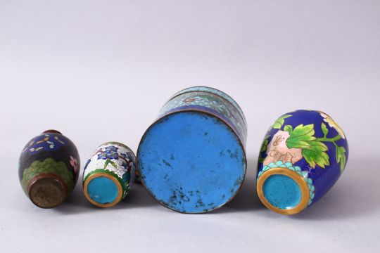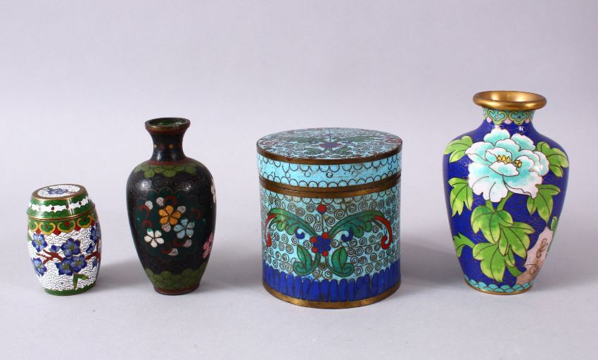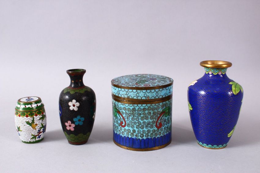 A MIXED LOT OF FOUR CHINESE CLOISONNE VASES / BOX - consisting of a cylindrical lidded blue ground floral stylized butterfly box, 7.5cm diameter, with a small white ground lidded barrel form box and cover 5.5cm, a blue ground floral vase, 10cm, and a black ground floral vase, 9cm. (4)