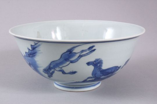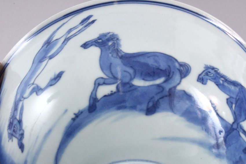 A CHINESE QIANLONG PERIOD BLUE & WHITE PORCELAIN EIGHT HORSES BOWL, the bowl decorated with the scenes of the eight famous horses, the base with a six character qianlong mark and of the period, 19cm.