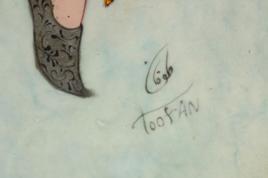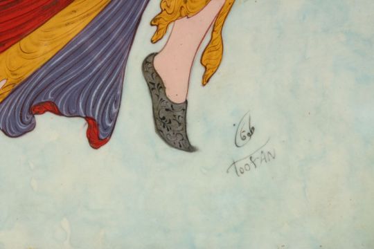A PERSIAN 20TH CENTURY PAINTING ON BOARD OF A GODDESS / FEMALE FIGURE, housed in a micro mosaic frame, signed in script with Toofan, 47cm x 37cm.