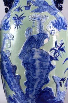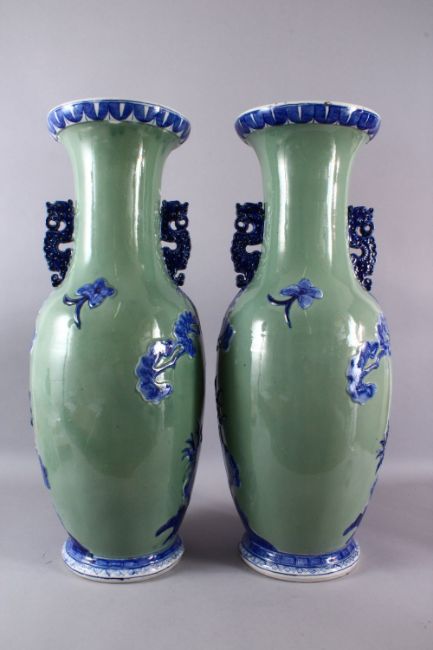 A LARGE PAIR OF 19TH / 20TH CHINESE CENTURY CELADON BLUE & WHITE PORCELAIN VASES, each decorated with scenes of phoenix birds and birds in relief, with deer and butterfly in landscapes, with twin dragon handles, 72cm