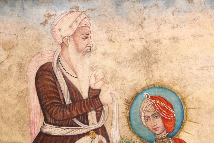 A FINE INDIAN MINIATURE PAINTING - the painting depicting a seated young prince surrounded by attendants on a balcony setting, with a dog recumbent, 28cm x 22.5cm