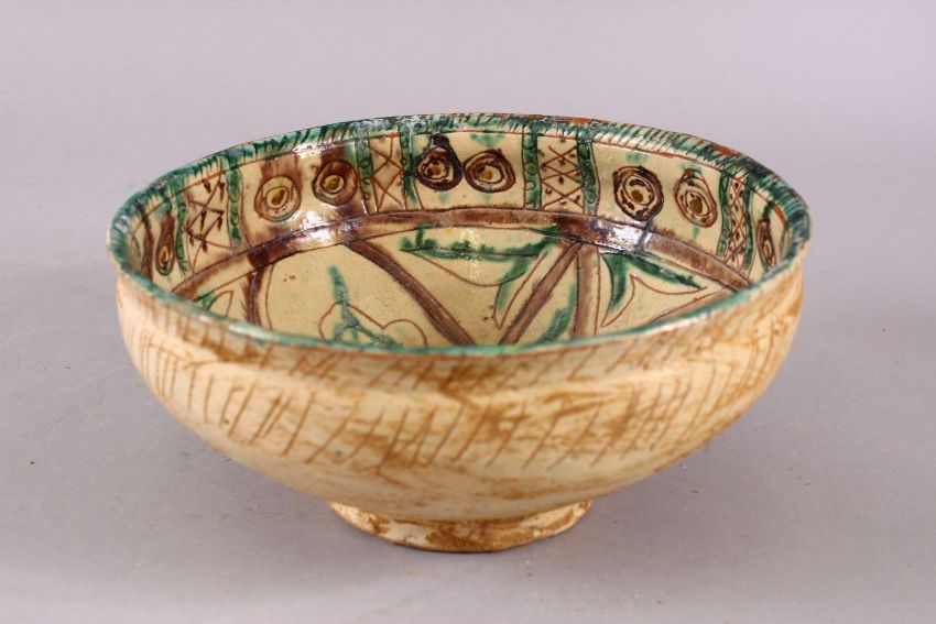 A GOOD IRAN STYLE POTTERY BOWL, decorated with green & biscuit grounds, with floral motif decoration, 20cm