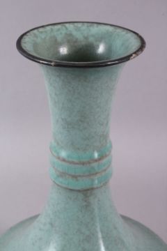 A CHINESE RU STYLE LONG NEC PORCELAIN VASE, with a ribbed neck, base with incised and gilded calligraphy & mark, 26cm