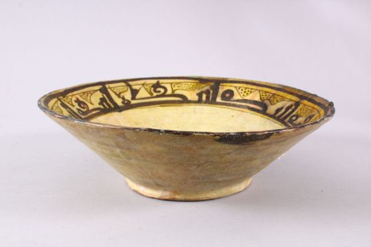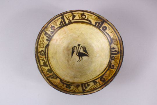 AN EARLY KASHAN POTTERY BOWL WITH KUFIC SCRIPT, the interior of the bowl with a bird central with bands of kufic script, 26cm diameter.