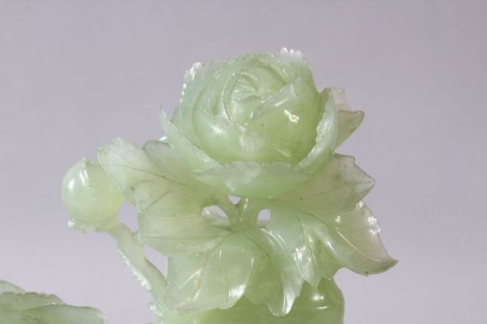 A CHINESE CARVED GREEN JADE FLORAL VASE, COVER & STAND, the vase enclosed with carved floral decoration, the cover likewise, with an inlaid carved wooden base, 20cm high x 18cm wide.