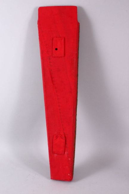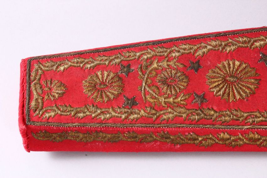 A 19TH CENTURY OTTOMAN EMBROIDERED TEXTILE ARROW POUCH & THREE ARROWS, the red pouch with gilt metal embroidery, the opoouch with three wooden arrows with ivory tips, 65cm high x 15cm wide.