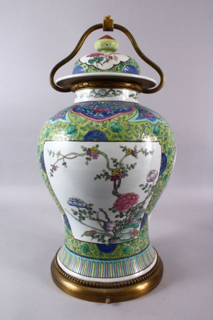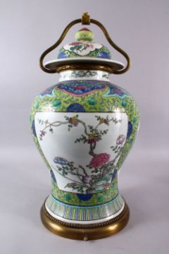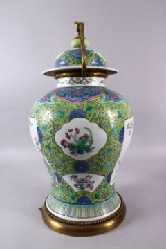 A CHINESE FAMILLE VERTE PORCELAIN VASE / LAMP, with panel decoration of birds in flora, green ground with floral decor, mounted for lamp, 52cm high