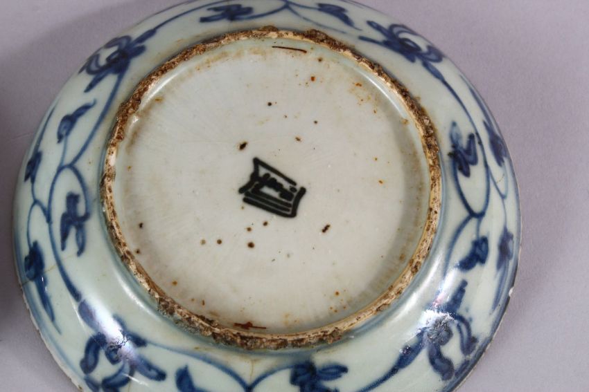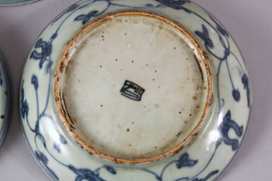 A SET OF 5 CHINESE BLUE & WHITE PORCELAIN SAUCER DISHES, with blue central decoration depicting deer, birds & butterflies in landscapes, with surrounding precious objects borders, the exterior with lotus decoration and a seal mark, 13.5cm