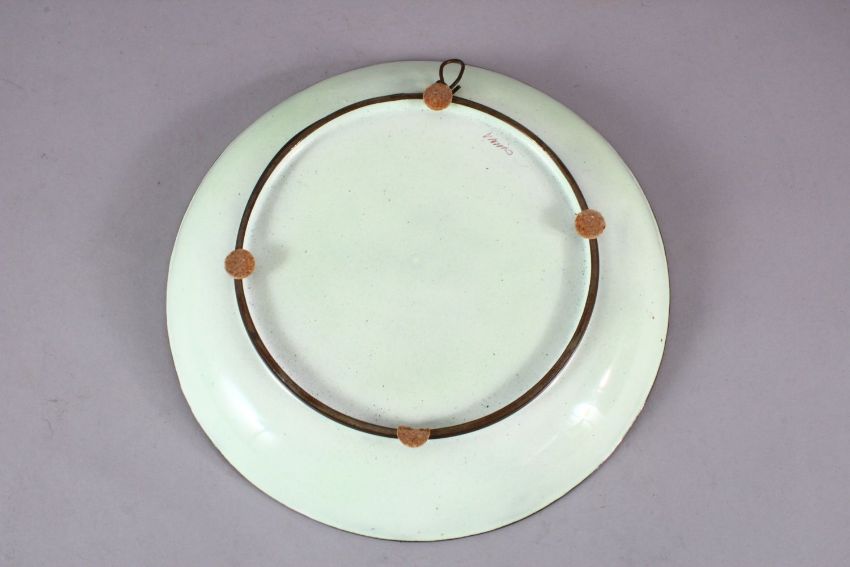 A CHINESE ENAMEL FLORAL DISH, the dish with a pale lime green ground depicting a bird seated in the branches of lotus spray, 21.5.