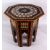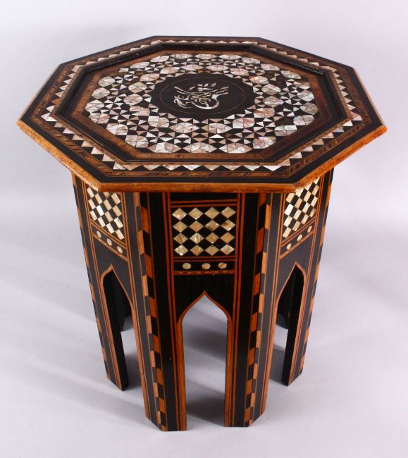 A 19TH CENTURY TURKISH OTTOMAN INLAID MOTHER OF PEARL & EBONY OCTAGONAL TABLE, the top inlaid with calligraphy in pearl, with further geometric inlays, 53cm x 47c,.