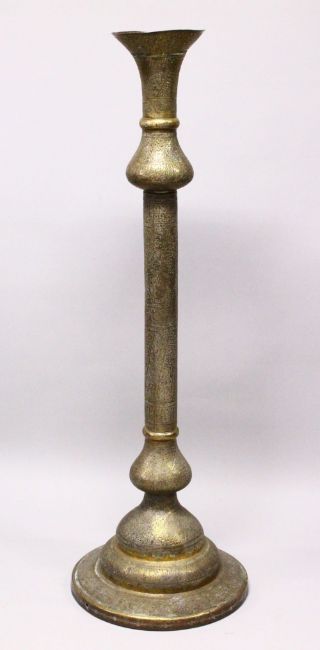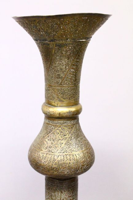 A 19TH CENTURY QAJAR OPENWORK CANDLESTICK, with open work decoration and a profuse amount of calligraphy,in three pieces overall measuring approx 160cm high.