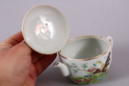 A CHINESE FAMILLE ROSE PORCELAIN TEAPOT, COVER & SAUCER DISH, each decorated in a similar way depicting butterflies in landscape settings, the teaport with an iron red seal mark to base, the saucer with iron red bats and seal, teapot: 13.5cm wide, the saucer 16cm diameter.