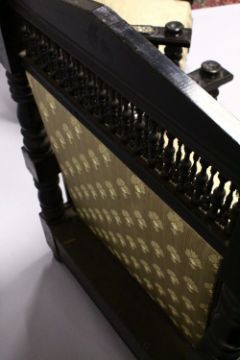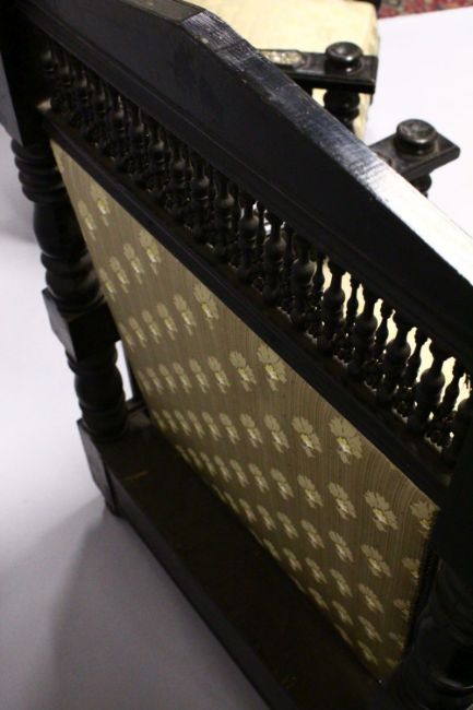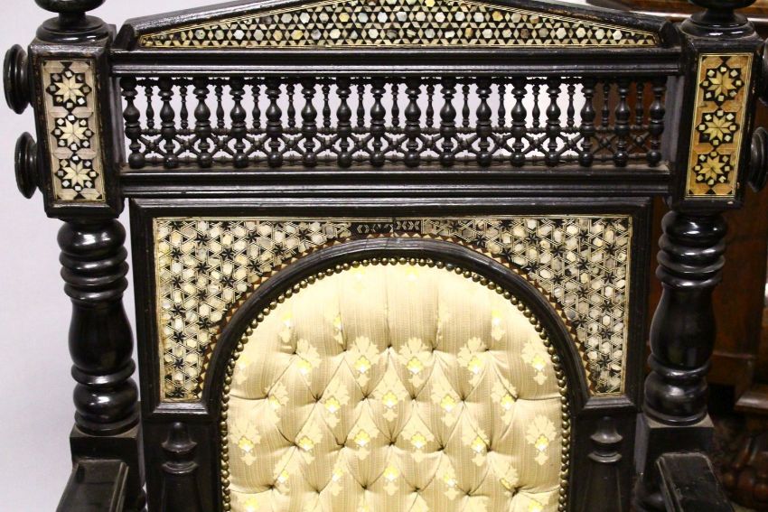 A LARGE PAIR OF LATE 19TH CENTURY MOORISH EBONISED ARMCHAIRS with upholster backs and loose cushions, mother of pearl inlaid decoration and mashrabia work panels, 77cm wide, 112cm high, 76cm deep.