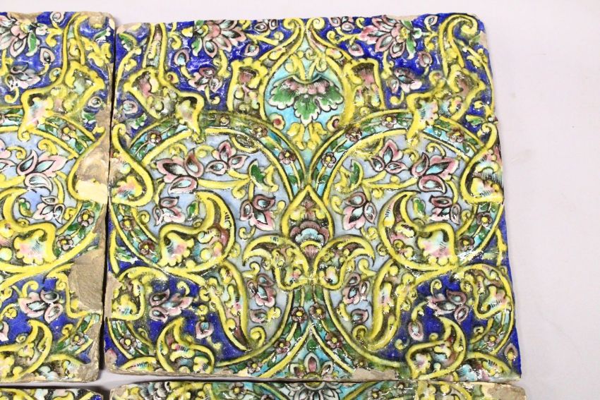 A LARGE & FINE SET OF 6 LATE SAFAVID / EARLY QAJAR POTTERY TILE SECTIONS, the six sections each of square form with poly chrome yellow upon a cobalt blue ground, placed together to depict a larger decorative scene depicting floral motif panels with a scrolling foliate and floral design, picked out with further sky blue, greens and pink poly chrome, each section approximately: 39cm square.