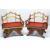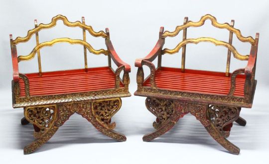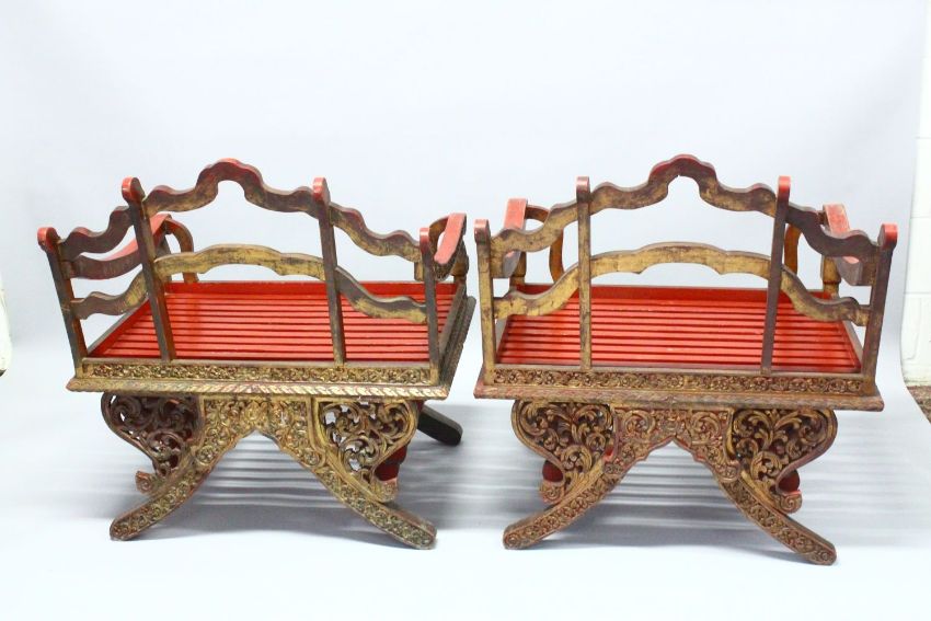 A PAIR OF 19TH/20TH CENTURY THAI CARVED HOWDAH ELEPHANT CHAIRS, profusely carved and pierced with gilt decoration, later slatted seats, 92cm high, 83cm wide, 71cm deep.
