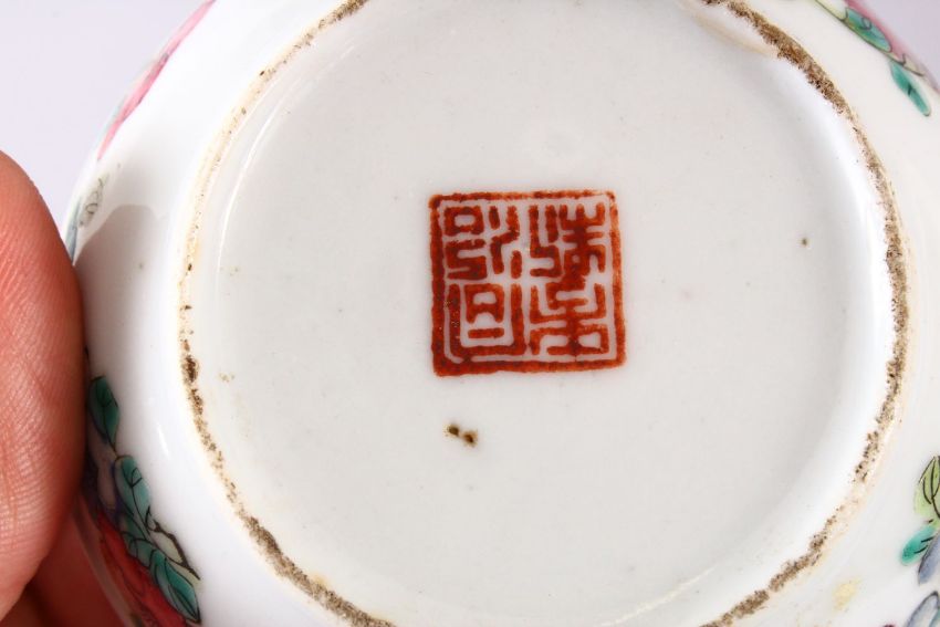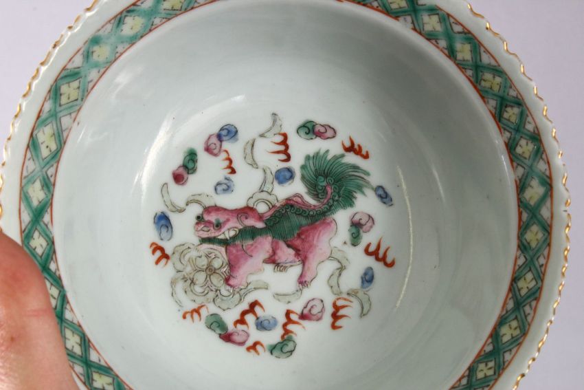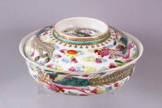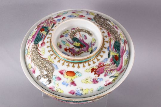 A MIXED LOT OF 12 19TH CENTURY CHINESE FAMILLE ROSE PORCELAIN OBJECTS, to name a few a pair of stem dishes decorated with butterflies and lotus 7.5cm high x 14cm diameter, a small cylindrical box and cover, red seal mark 9cm diameter , a phoenix decorated rice bowl and cover, the base with a red mark 16cm, and eight other items. (12)