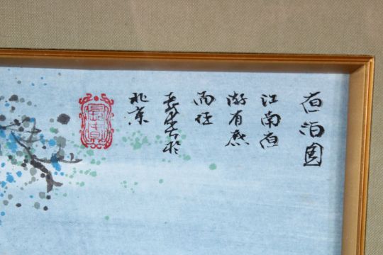 A CHINESE FRAMED PAINTED WATERSIDE LANDSCAPE VIEW, the picture painted on paper, depicting a waterside native view, signed and sealed upper right, framed:44cm x 41cm.