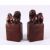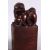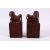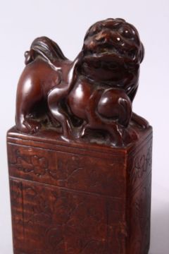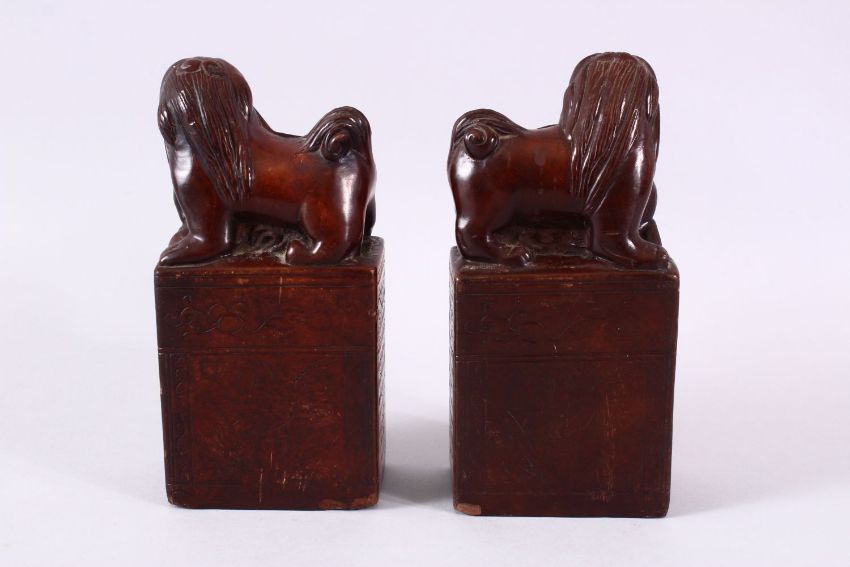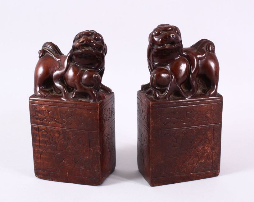 A PAIR OF UNUSUAL TERRACOTTA / POTTERY LION DOG SEAL / DESK WEIGHTS, each dog modeled with their paw upon a ball, the body with carved floral lotus decoration, 18.5cm high x 9cm wide.