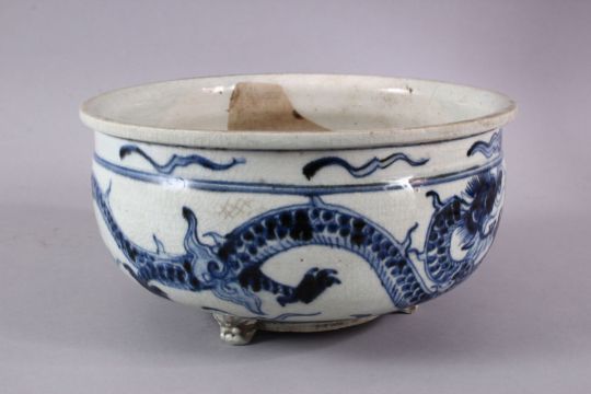 A CHINESE BLUE & WHITE PORCELAIN DRAGON TRIPOD POT / PLANTER, the body with a crackle glaze and decorations of dragons amongst clouds, with three moulded lion dog mask feet, 24.5cm diameter x 12.5cm high